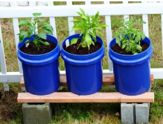 Any container that can hold soil can be used. It's not necessary to spend money on fancy pots. Avoid smaller containers as maintaining soil and growing conditions can be challenging. Old vinegar jugs, bowls and pails work well. The pails provide the added benefit of having handles allowing them to be moved around easily to where growing conditions are better. They can also be carried inside as the temperature cools extending your season.